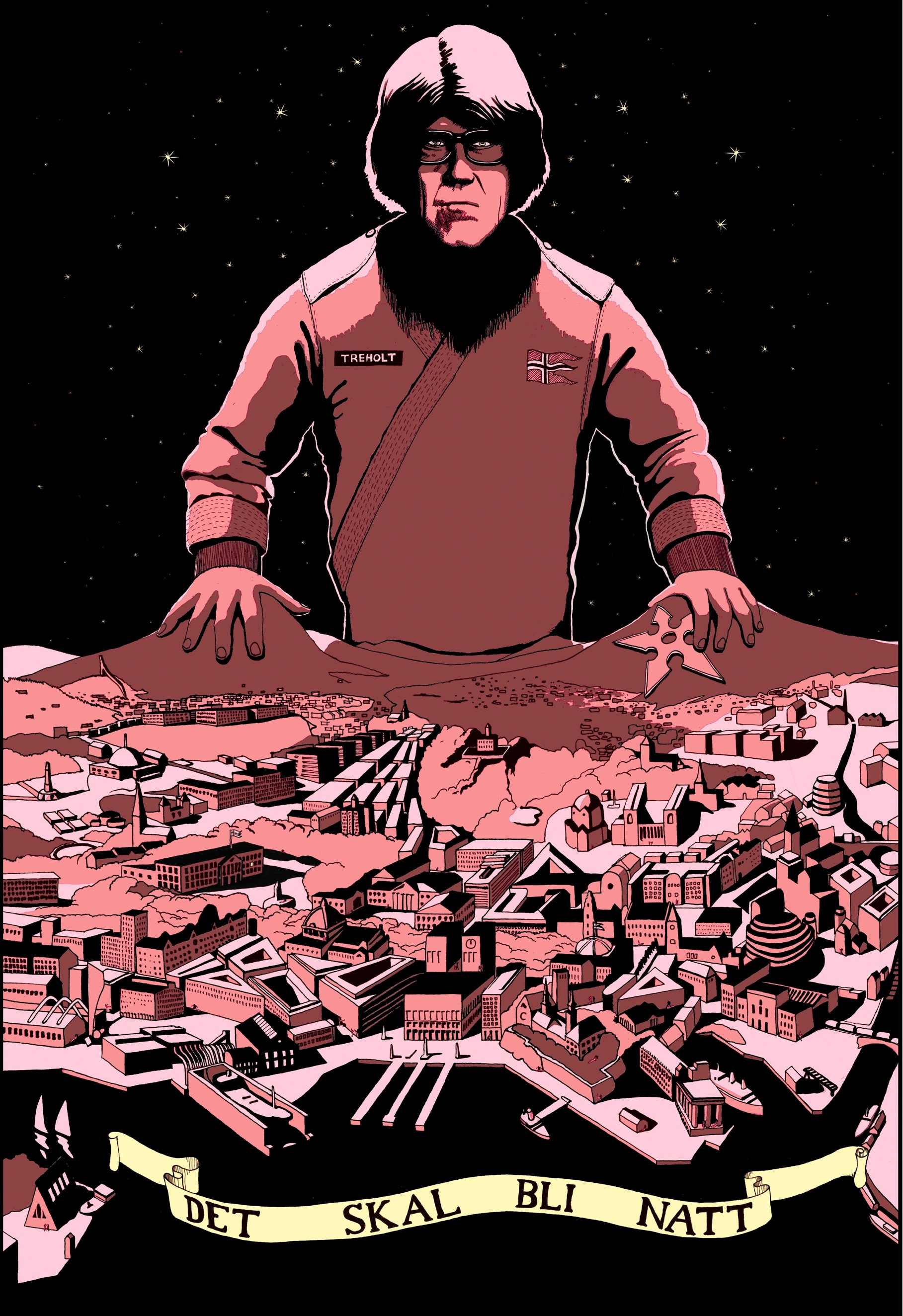 Sammen med illustratør Harald Frøland laget Thomas en plakat helt uavhengig av filmprosjektet i 2007. Vi var i skrivefasen på det tidspunktet. Kun noen ytterst få eksemplarer ble trykket. Ett av dem hang en stund nede på Tamara Pub ved Birkelunden, men er tatt ned nå. Men motivet med Ninjamester Treholt ruvende over Oslo, det ble hengende igjen. Vi bestemte oss altså for å prøve dette motivet som hovedplakat allerede tidlig i forarbeidet. Under opptaksfasen hadde vi to dager med stillsopptak i studiosetting, som gikk parallelt med filmopptakene. I pauser fra filminga gikk skuespillerne i fullt kostyme innom stillsfotograf Ellens studiokrok, i begge tilfeller satt opp i nærheten av der vi filmet. Hun tok en masse bilder med tanke både på plakaten og annet materiell, og det har vi fått mye igjen for. For å supplere elementer til plakaten hentet vi også inn noen frames fra filmens Red-materiale.