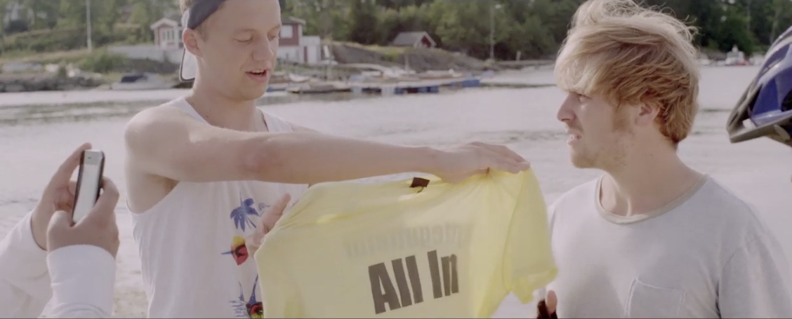 Dagen etter spiller gutta badminton i underbuksa da Jos kjæreste Ane kommer. Guttas umodne kvinnesyn spretter opp av overflaten når de kaller Anes venninne Kristine «Badeballen» (filmens arbeidstittel, kanskje mer salgbar enn den valgte, som like godt kunne vært «Elefanten i rommet»?). Nye kleine måltider gir stadige stemningsskift, og dagen ender i nattbad, bryting, gitarspill og øl i rompa til Kristine. Fritz treffer godt for en gangs skyld: “dere er meg en interessant vennegjeng”. Aurstad Gjernes bærer også mange av disse scenene, med en stadig fordypning inn i rollefiguren Lasse. Han synes å være den eneste som fortsatt tar gjengen på alvor, og som forstår at noe står på spill. “All in” betyr derfor ofte «nådeløs» og «brutal». Han hopper i det med huet først. Ansvarsløshet kan også være å ta et slags ansvar.