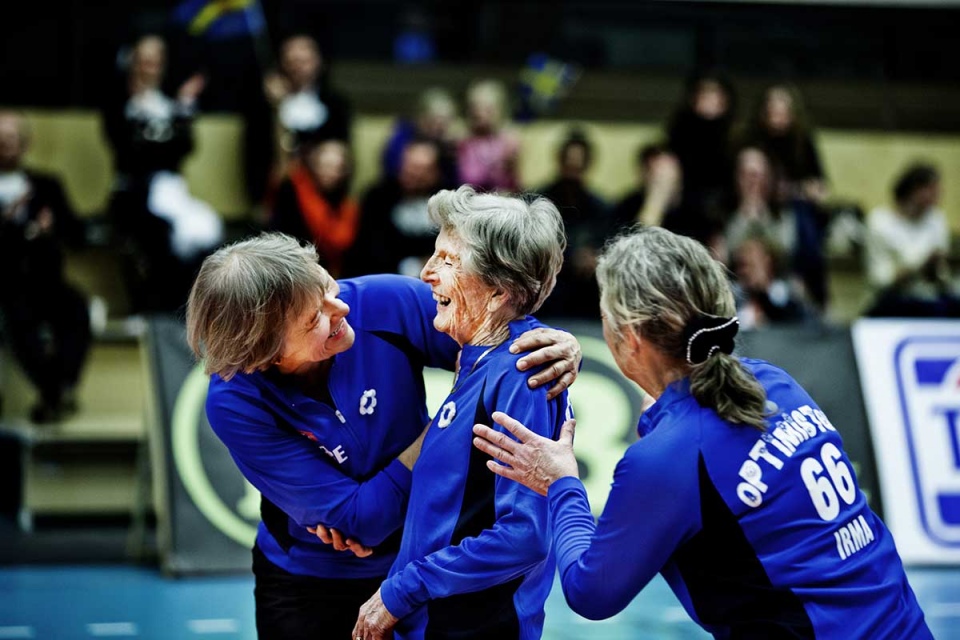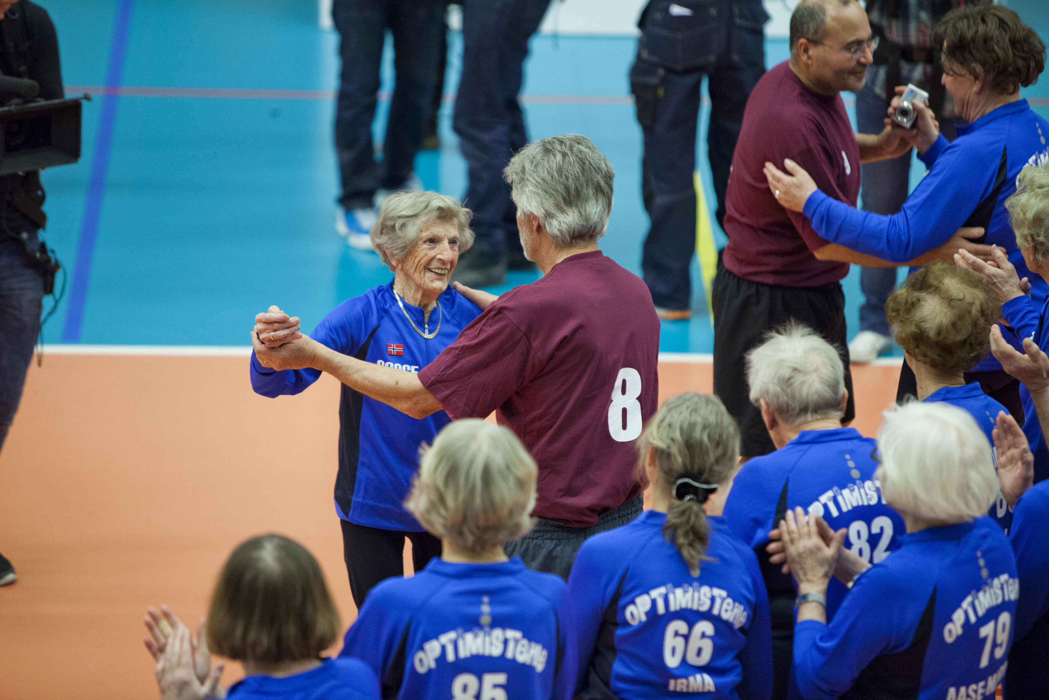 Optimistene har også problemer med konstruksjonen av begivenheten som utgjør den dramaturgiske motoren i filmen, «landskampen» mot Krutgubbarna i Sverige. Jeg tviler på om det hadde blitt noen slik kamp hvis ikke filmteamet hadde vært inne i bildet. Til dét er rett og slett ambisjons- og nivåforskjellen mellom de to lagene for stor, noe som tydeligvis går fram etter første sett i kampen. I andre sett tar herrelaget fra Sverige pent hensyn til filmen og «legger» seg galant ned – og lar Optimistene få en settseier. Her blir kontrasten til Män som simmar, der laget vi følger faktisk går hen og vinner på ordentlig, mot alle odds, ekstra stor.