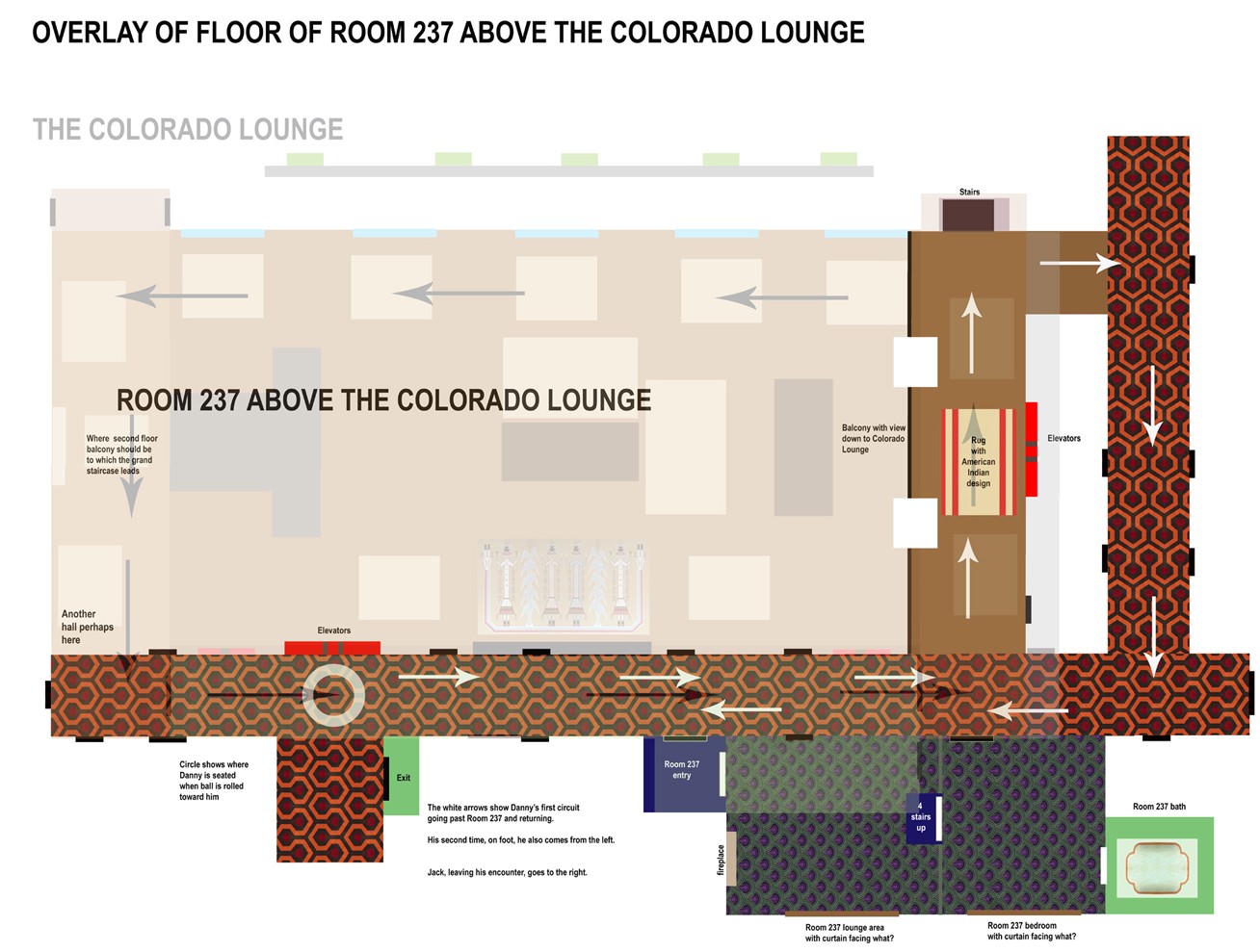 På sitt beste er Room 237 regelrett uhyggelig i sin absurditet. Som i kapittelet der en New York-basert filmklubb har funnet ut at den amerikanske versjonen av The Shining (som er lengre enn den europeriske) er strukturert slik at den kan spilles fra «begge sider» (det vil si at filmens første innstilling passer overens med den siste, og så videre). Hvis man avspiller filmen forlengs og baklengs på samme tid, vil man oppdage at påtagelig mange bilder smelter sammen med hverandre og danner nye, forstyrrende motiver (se videoen nederst i artikkelen).