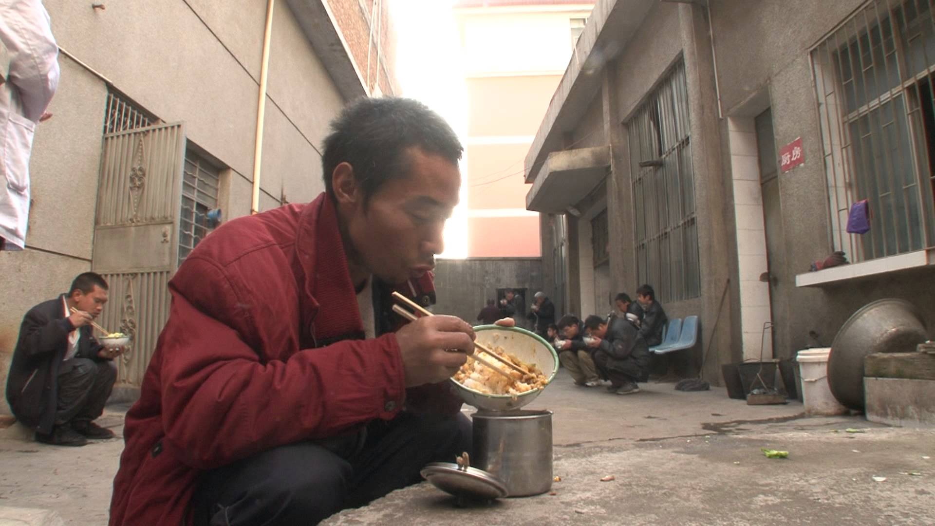 Et stykke ut i filmen slipper én ut av institusjonen og kommer hjem til familien sin. For et kort øyeblikk er det befriende. Det er befriende å være utenfor murene og se og kjenne frisk luft. Men befrielsen er like kortvarig som gleden av en kjeks i fengselet. Tilværelsen, vilkåret her utenfor institusjonen, i sin øyensynlige fattigdom, er den egentlig bedre? Der noen filmskapere ville kjørt på med dollyshots eller svevende krankjøringer, for å gi et inntrykk av en nyvunnet frihet, holder Bing oss på asfaltens bakkenivå og ber oss kjenne på den materielle virkeligheten, som preges av ufrihet også utenfor murene.