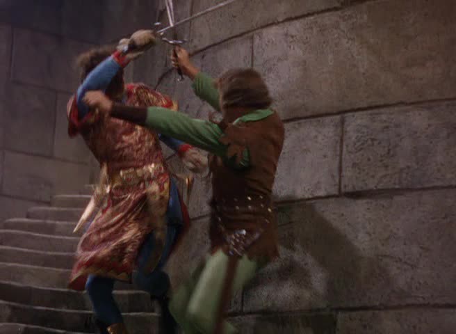 I kanskje filmens beste sekvens, velger Curtiz på ekte ekspresjonistisk vis å bruke skygger for å formidle dramatikk i den ikoniske fektescenen mellom Robin Hood og Sir Guy of Gisbourne. Skyggene blir brukt som en kontrast til filmens sterke bruk av farger, og Curtiz lar deler av scenen utspille seg i en trapp og under en brennende lysestake, før den avsluttes med et brutalt fall.