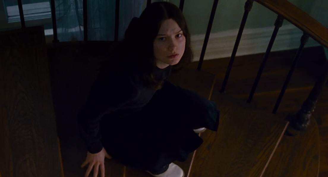 Charlie spør om niesen forstår hvorfor han befinner seg i en ufordelaktig posisjon. Forklaringen hans lyder: «Because you’re standing below me.» Idet India beveger seg opp, trinn for trinn, klippes det til en innstilling der kameraet er tilbake i stuen. Denne begynner som et totalbilde, og rammer inn den buede trappen mellom veldige dørkarmer, for så å bevege seg innover og oppover, i takt med Indias forflytning (det er som om møtet starter på nytt, med de nødvendige formalitetene på plass). Til slutt står hun og onkelen i øyehøyde, før han vender nesen mot første etasje; Charlie har trengt seg inn på Indias territorium, og markerer på en flørtende måte at han kjenner sin plass. Han plystrer bekymringsløst, tilsynelatende uberørt av brorens bortgang.