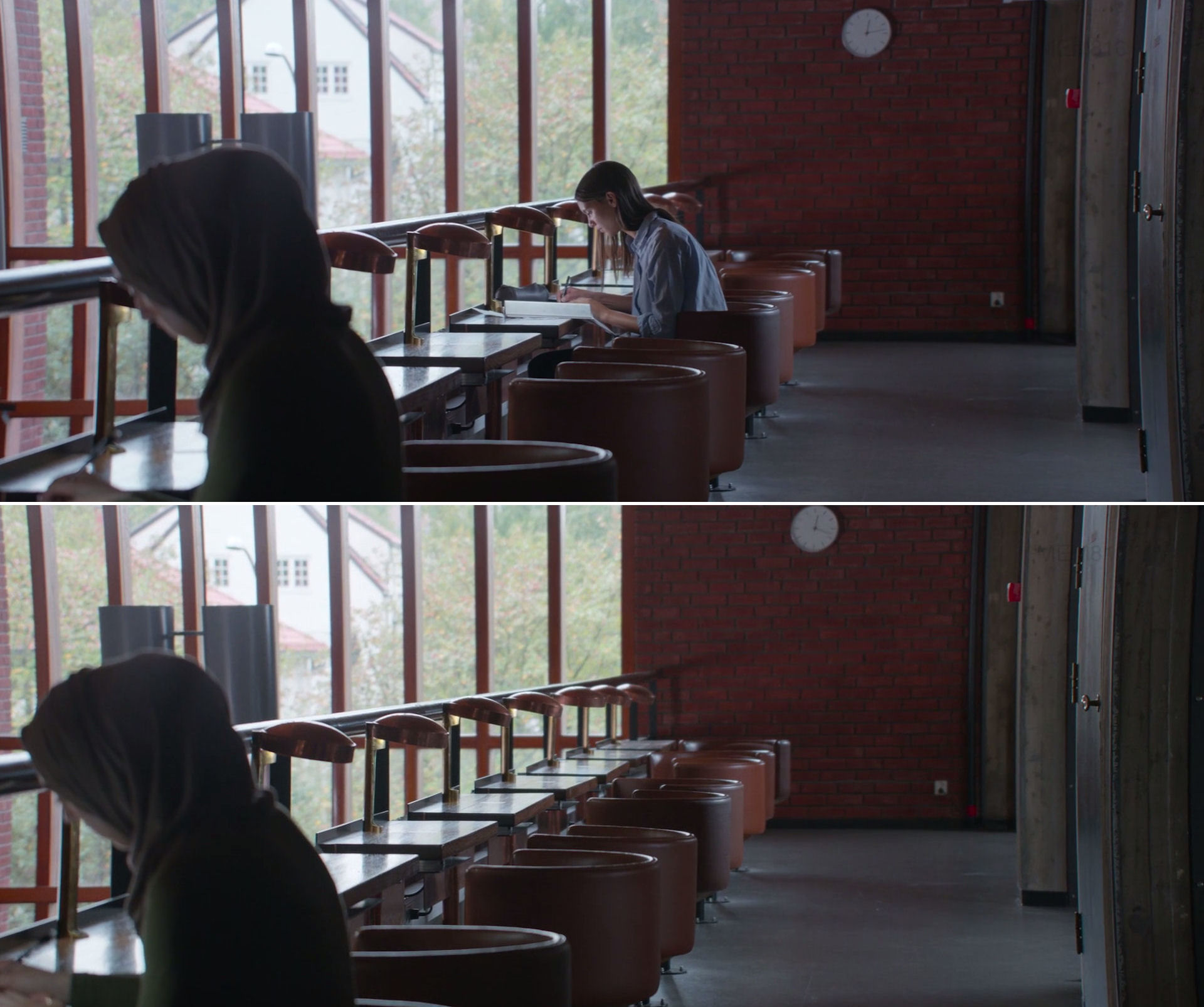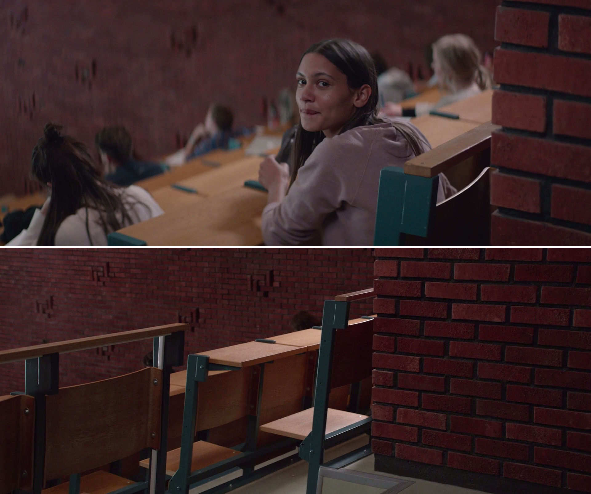 I hovedhistoriens start – oversiktsbildet av Blindern, Thelma i alleen etterpå, så på forelesningen – får vi inntrykk av at dette skal være en sammenhengende forflytning. Imidlertid har Thelmas jakke forandret farge fra beige til grønn i det siste klippet.