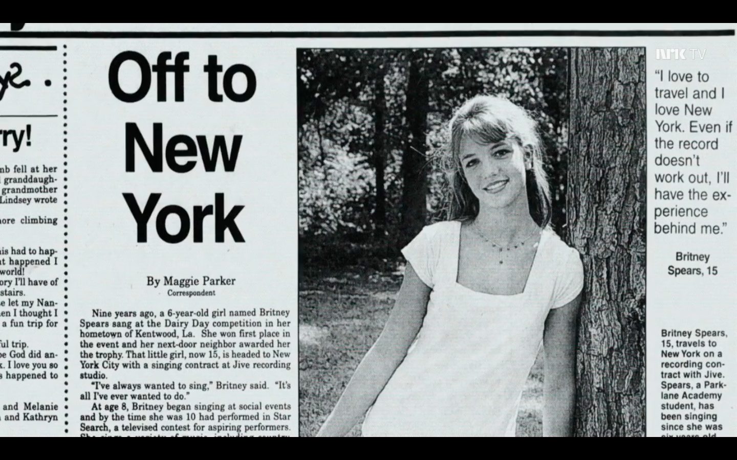 Britney Spearsstardom sammenfalt med skandalen knyttet til forholdet mellom president Bill Clinton og Monika Lewinsky, som bidro til at media begynte å omtale sex og relasjoner på en ny og bramfri måte. Fred Durst kalte Lewinsky for ei hore og Clinton for en pimp fra scenen, til jubel under Woodstock ’99. Årets dokumentar argumenterer for at sexfikseringa i kjølvannet av Lewinsky-saken gikk utover Britney og andre unge, pene kvinner. Journalister kunne kommentere puppene hennes på tv, eller konfronterte henne med at hun provoserte «a lot of mothers». Hun måtte svare for andres indignasjon før hun var gammel nok til å kjøpe alkohol. Hun fikk spørsmål om hun var jomfru, hvorpå hun svarte at hun foretrakk å vente til hun var gift. (En scene som vekker assosiasjoner til rollefiguren Starlight i Amazon-serien The Boys, som mottar et lignende spørsmål og svarer det samme som Britney, engstelig for å utpekes til skjøge om hun forteller sannheten på kristenevangelistisk TV).