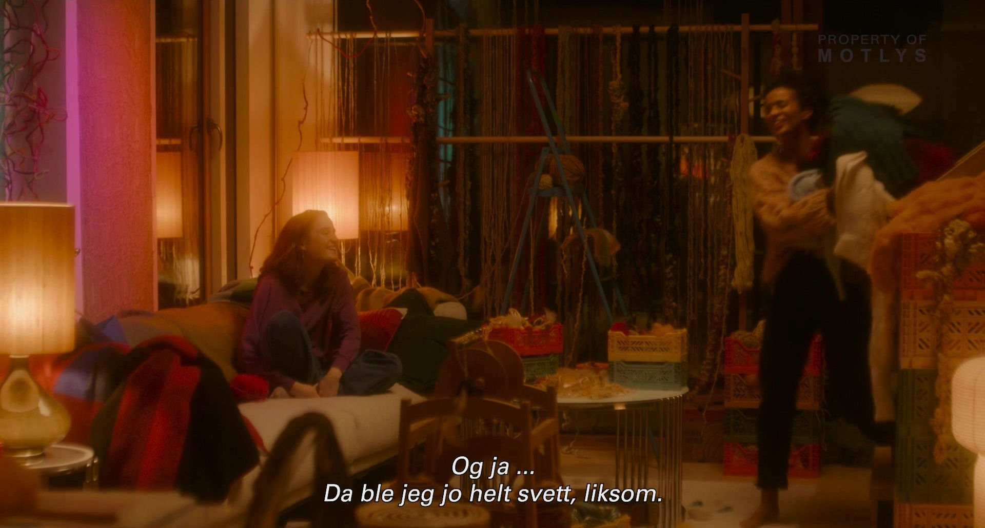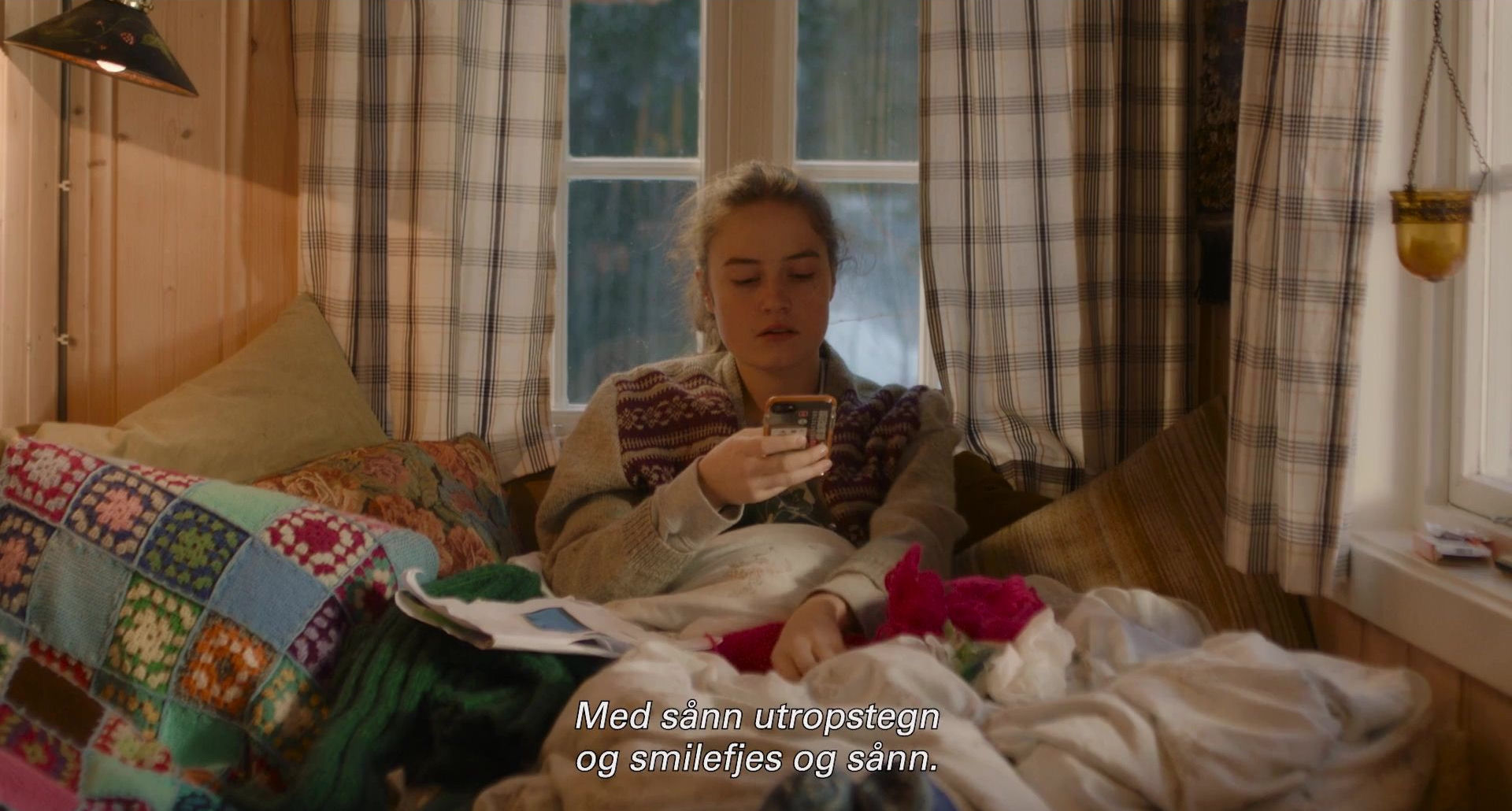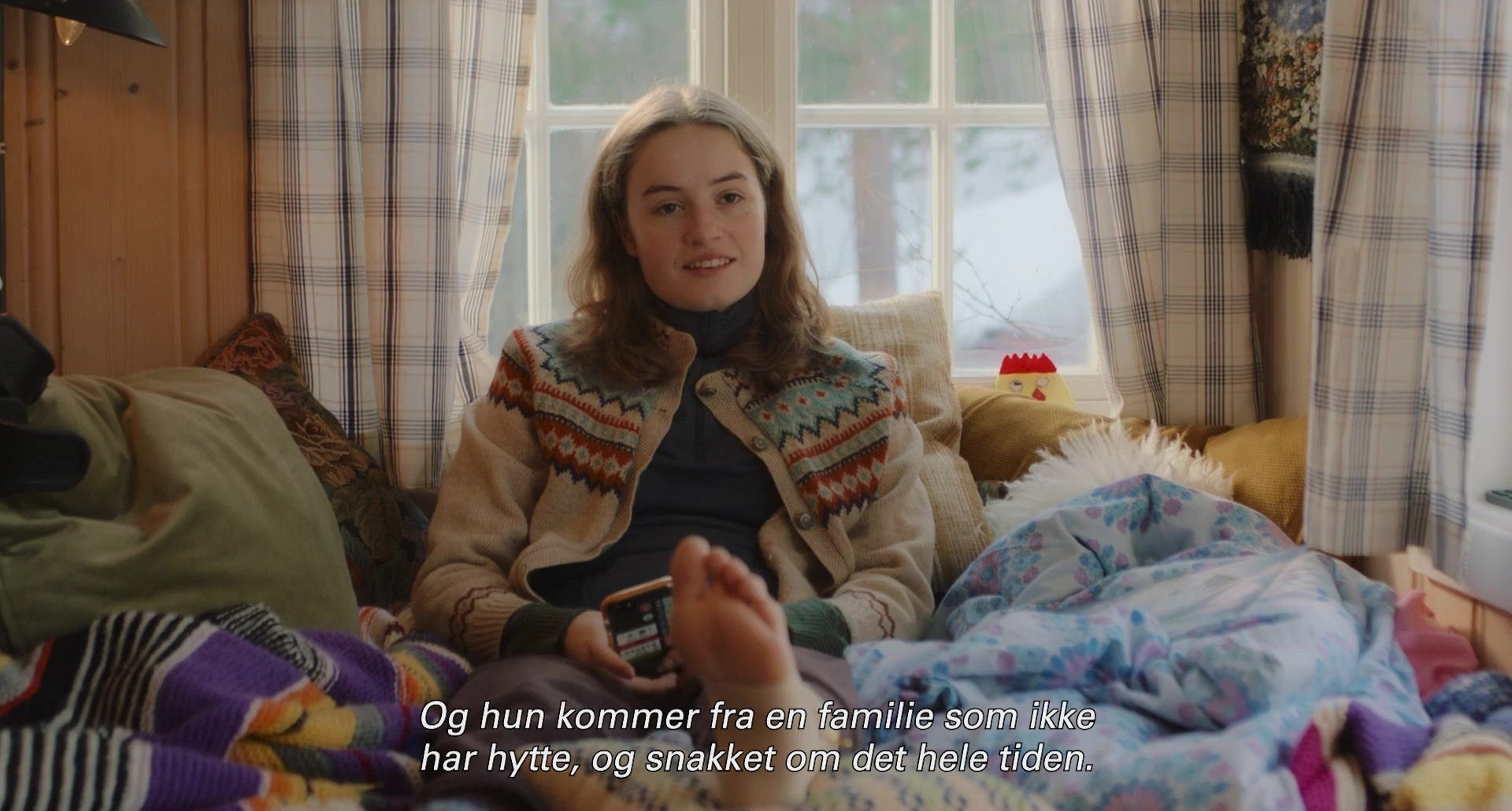 Lysbildeserien under illustrerer i hvilken grad filmen til tider er overlesset med alskens plagg, pledd, dyner og puter. Rollefigurene går i tillegg med tykke sokker innendørs.