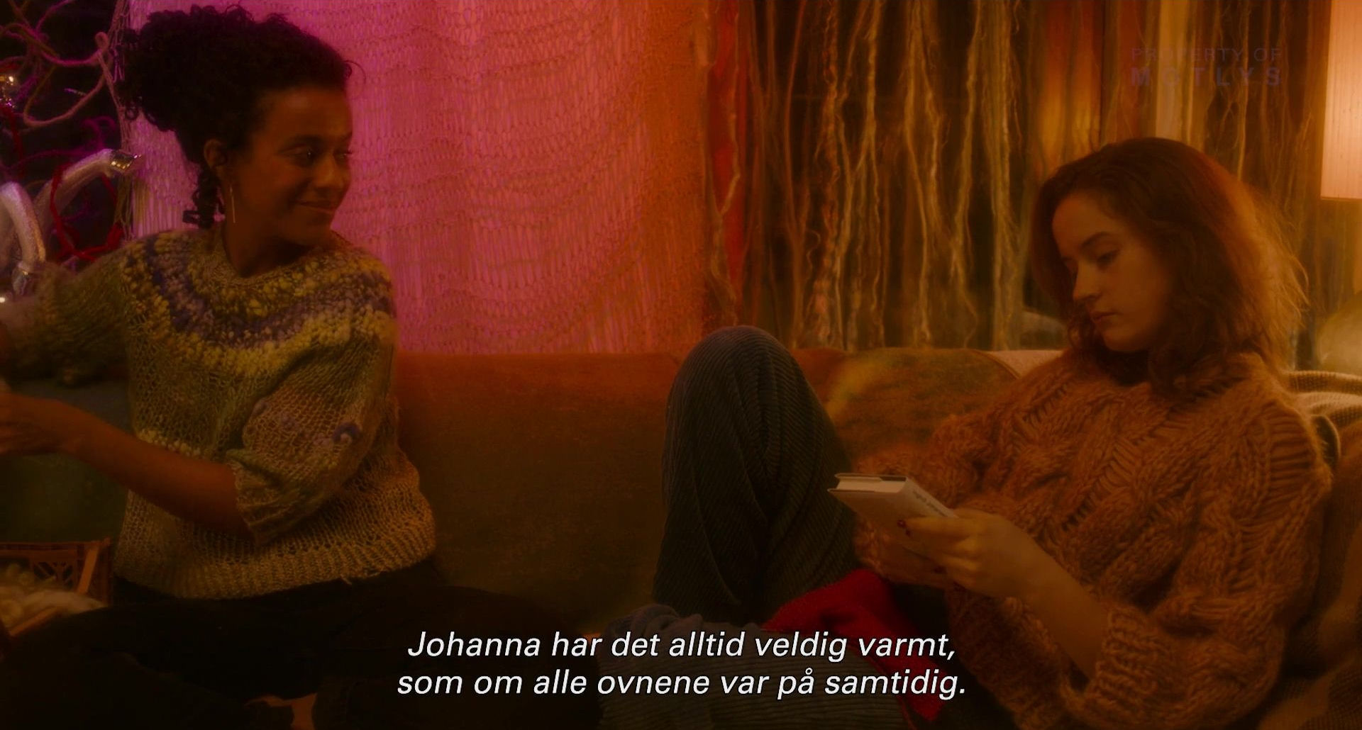 - På spørsmål om Johanna merket at Johanne var forelsket i henne sier hun først kategorisk nei, så «først absolutt ikke», og «så kanskje litt» og «hun ville jo lære å strikke» (redder seg litt unna).